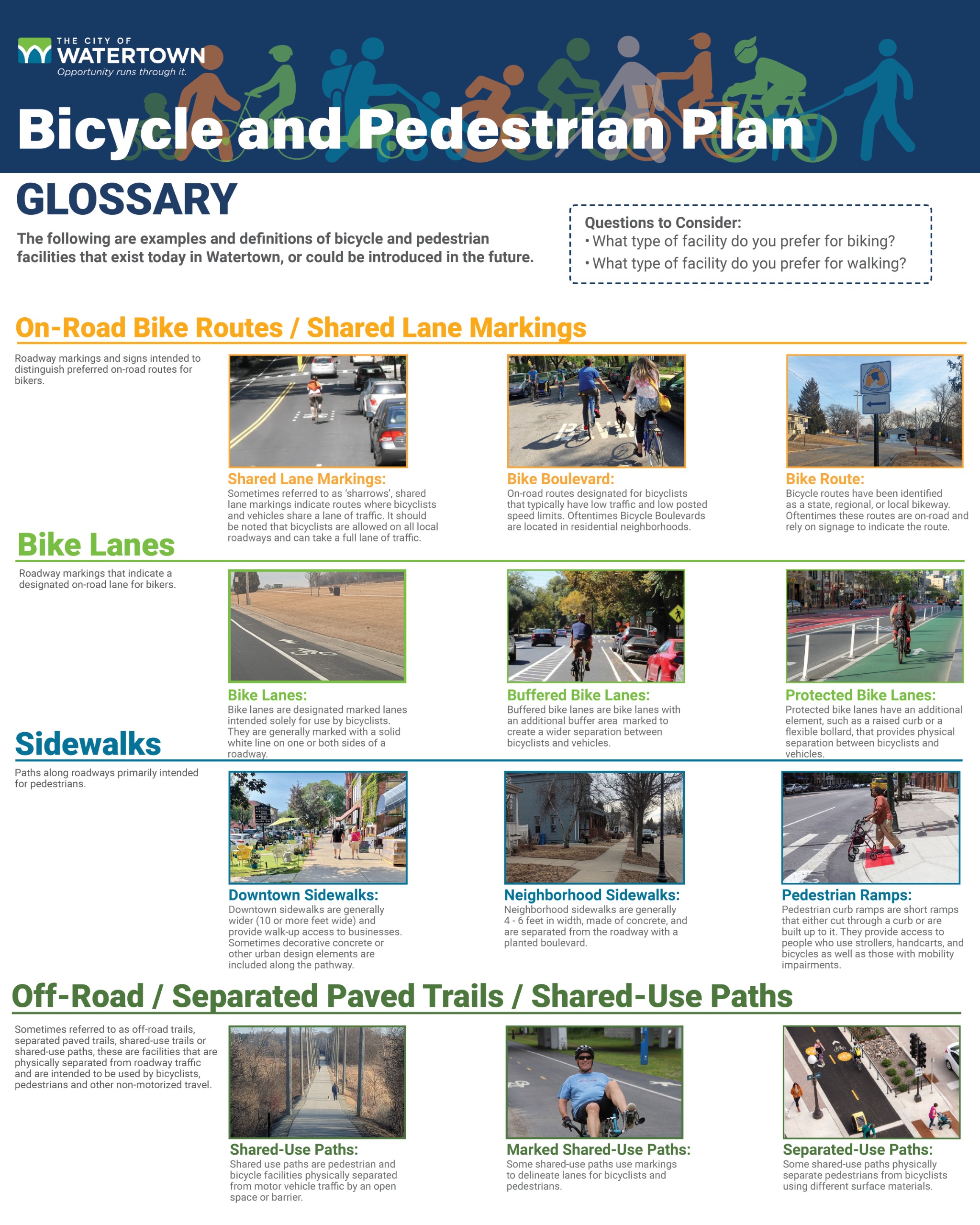 Click on the image below to learn more about common bicycle and pedestrian treatments that either exist today in Watertown, or that could be installed in the future.